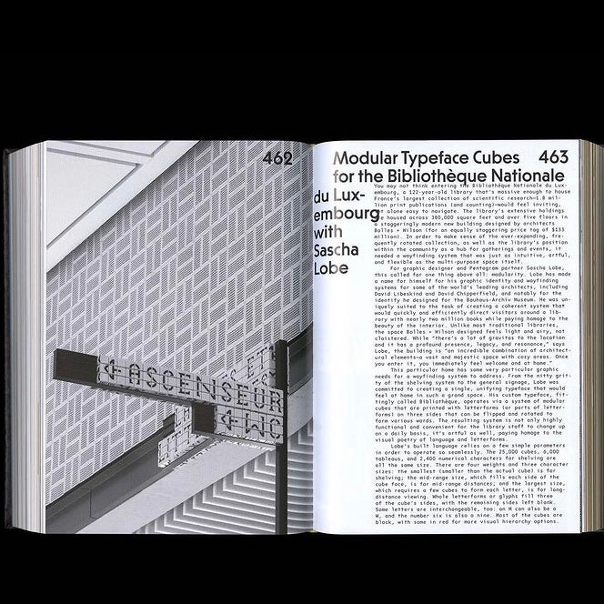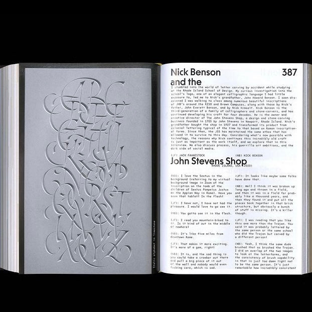 内容は114人のデザイナーによる156ものフォントを収録。各ページではフォントの詳細はもちろん、ものによっては購入先サイトも掲載されており、巻末の検索セクションと併せて極めて実用性の高い、使える本になっています。目玉の特集として、デザインした文章を石に彫る専門ショップ The John Stevens Shopのオーナー Nick Bensonとグラフィックデザイナー Jack Fahnestockによる対談も。前作は完売後に探す方が非常に多かったので、お早めにどうぞ。