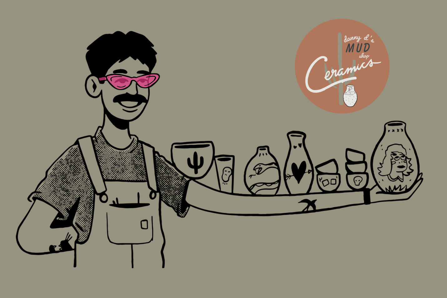 アメリカ・ロサンゼルスのエコーパークにて、サンタ・フェと呼ばれる赤い土を粘土にした物から作られる陶器に、ローファイなアートを絵付けではなく全て彫り込んでから色を描き込む、とても手数が掛かり難しい手法で作られています。