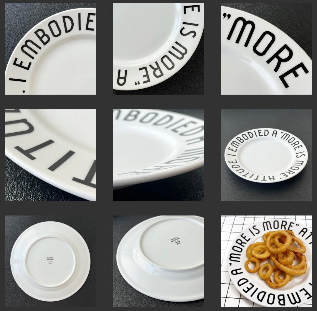 インテリアにおいても物が多くて楽しげなことだったり、 物をたくさん見て刺激を受けたり学んでいくということです。そんなメッセージを現代アートの感覚で、特徴的なフォントを使いプレートのリムに施しました。