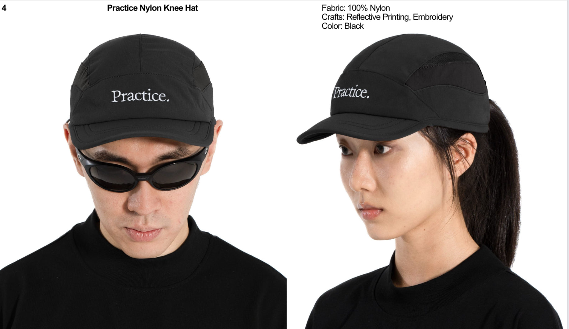 Knee Hatシリーズのナイロンバージョン。フロントにPractice.の刺繍、サイドにリフレクティブプリントでロゴが落とし込まれています。短めのツバが曲がるフレキシブルバイザーです。