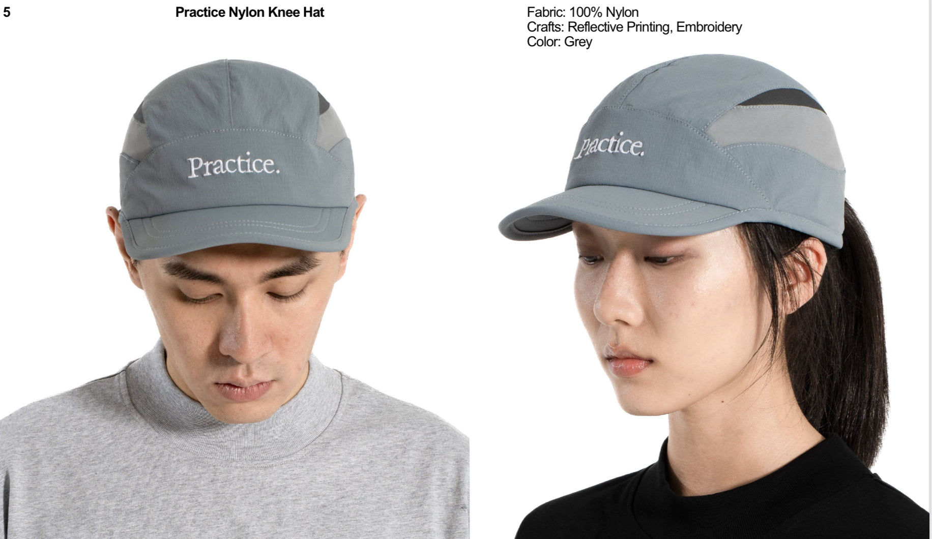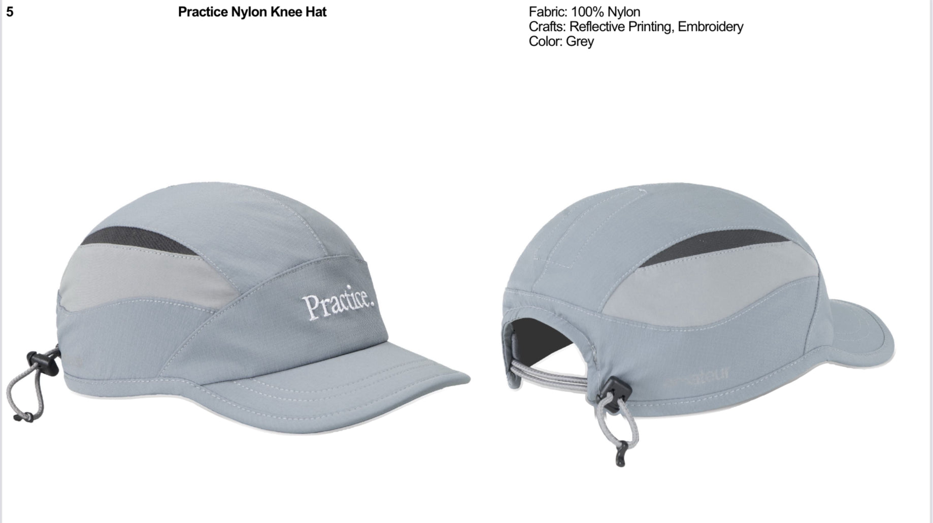 Knee Hatシリーズのナイロンバージョン。フロントにPractice.の刺繍、サイドにリフレクティブプリントでロゴが落とし込まれています。短めのツバが曲がるフレキシブルバイザーです。